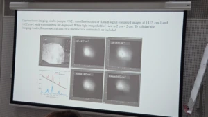 The seminar concluded with a discussion focusing on the importance of multimodal imaging methods for earlier and more accurate cancer diagnostics. The audience showed strong interest in the applied methodologies and raised questions regarding the separation of Raman and autofluorescence signals during imaging data processing, as well as calibration of filter tilt angles for Raman spectral band imaging. The discussion also covered the physical operating principles of Optical Coherence Tomography (OCT) and its practical application in biomedical research. In addition, the potential of zinc oxide (ZnO) tetrapodal nanoparticles synthesized at KTU for Raman signal enhancement was discussed, highlighting their applicability for investigations of unstained histological samples as well as for molecular composition analysis of other biological objects.